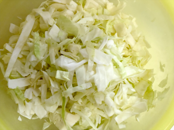 ① キャベツを塩でもみ5分おいておく。