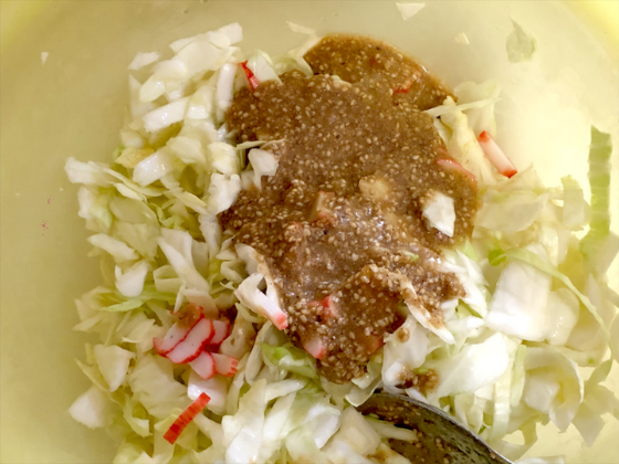 ② ①の水気を絞りレシピ:ごまマヨソースとカニカマを加えよく混ぜ合わせる。