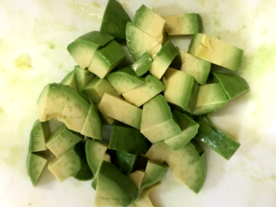 ・アボカドはタネを取って皮をむいて食べやすい大きさに切る→この時にレモン汁をかけて黒く変色するのを防いでおきましょう。