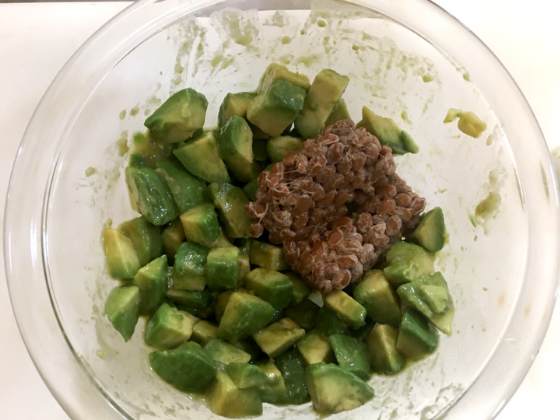 ① ボウルにアボカド、なっとう、アボカドなっとう調味料を加えて混ぜ合わせる。