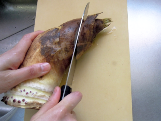 先端を斜めに切り落とすと、断面が広くなり、たけのこに熱が通りやすくなります👀