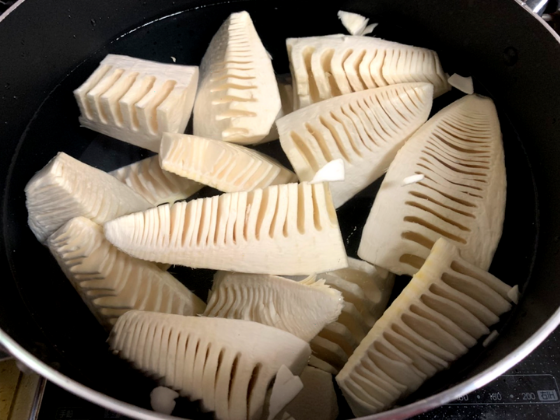 深くて大きな鍋に、たけのこを入れていきましょう!複数のたけのこをゆでる際は、できるだけたけのこ同士が重ならないようにしてくださいね⚠️
