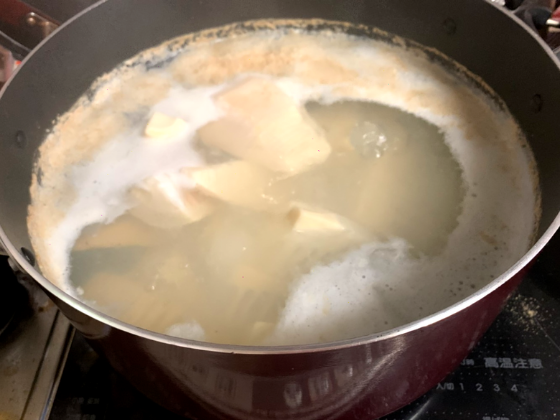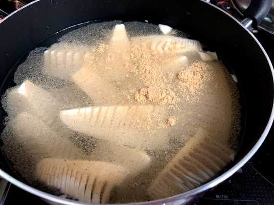 米ぬか加えたけのこが被る量の水を鍋に入れ、鍋を中~強火にかけ、沸騰させていきましょう!火加減を調整して、吹きこぼれない程度にぐつぐつ沸いている状態を保ってくださいね♪(´ε` )