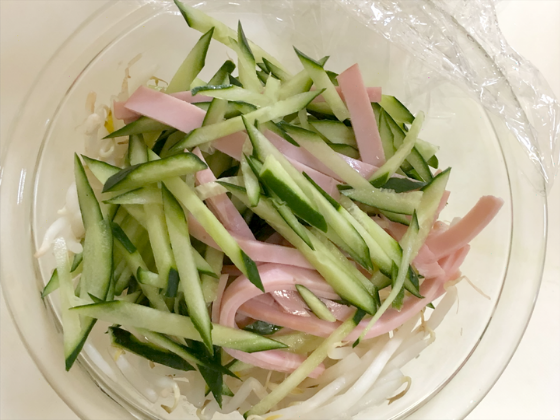 ・きゅうりとハムを千切りにしておく。