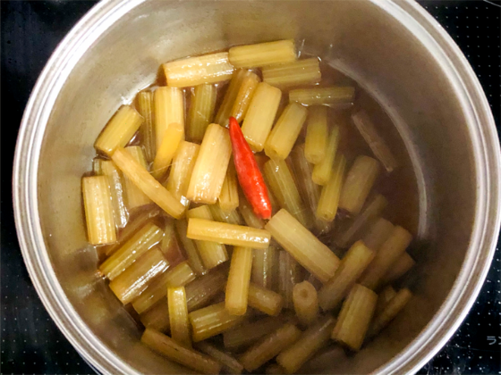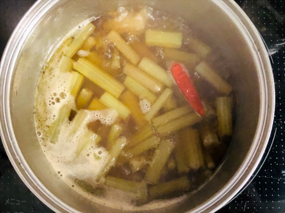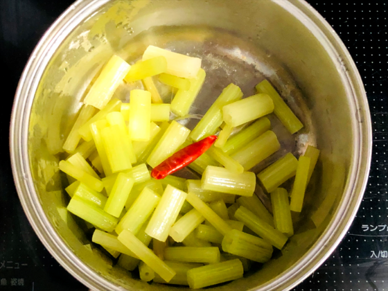 ① お鍋にごま油と鷹の爪・下ごしらえしたふきを入れて中火でサッと炒める。