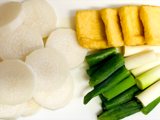 ・油揚げは半分に、大根は輪切りに、白ネギは3cm幅に切っていく。