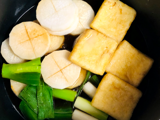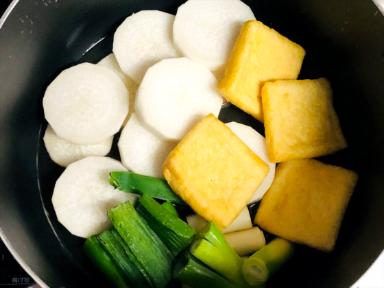 ① お鍋に水と顆粒だしの素、下ごしらえした大根・油揚げ・白ネギを入れて火にかける(中火)。