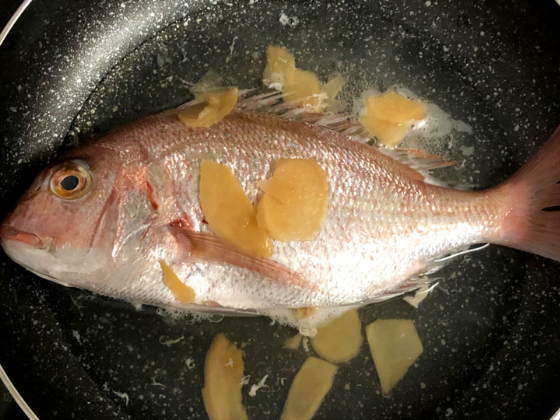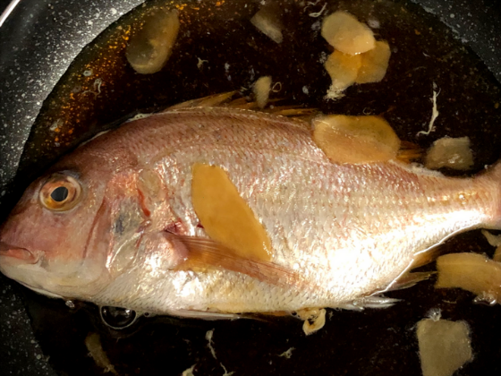 ① お鍋ORフライパンに水、白だしを入れて沸騰したらたいとしょうがスライスを入れる。
