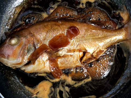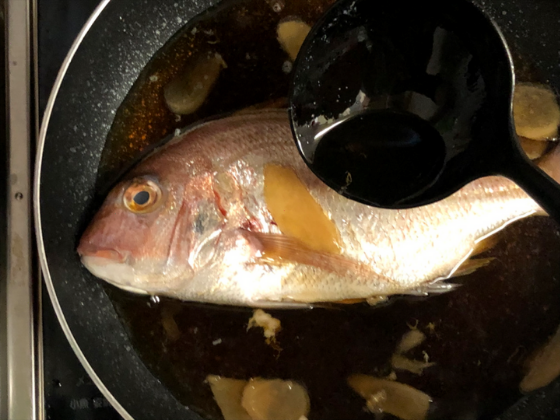 ◇たいを煮込んでいるときは、たい全体に味が染み込むように煮付け調味料をかけてくださいね。