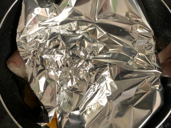 ③ 弱火で煮込んでいく→アルミホイルで落とし蓋をしておく。