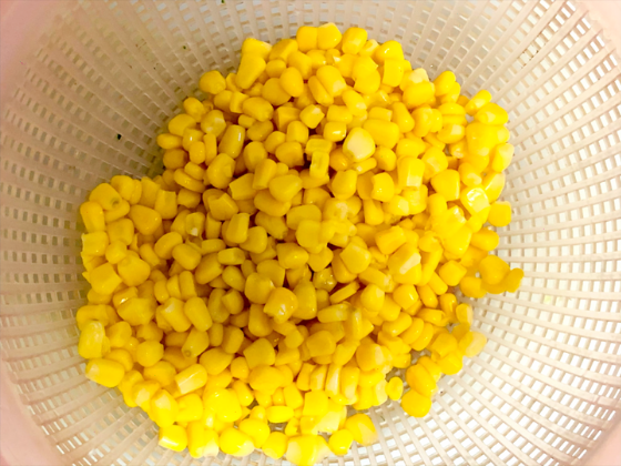 ・コーン缶のコーンをザルにあげて水気を切っておく。