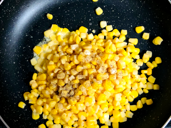 ① フライパンにバター・下ごしらえしたコーン・塩胡椒を入れて炒める(中火で6分くらい)。