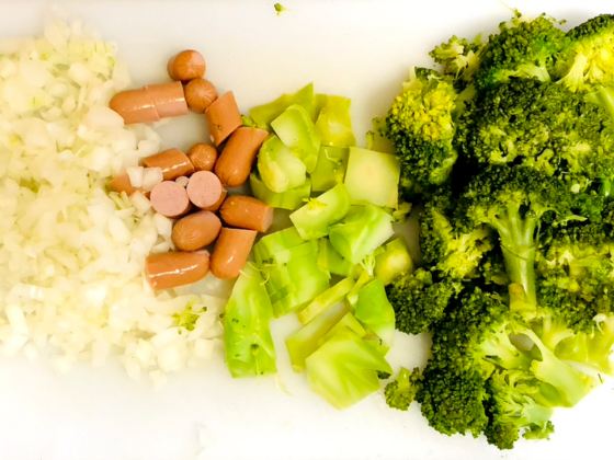 茹でたブロッコリーを茎の部分と花芽を切り分けて食べやすい大きさに切り分ける、玉ねぎはみじん切りに、ウインナーは大きめに切る。