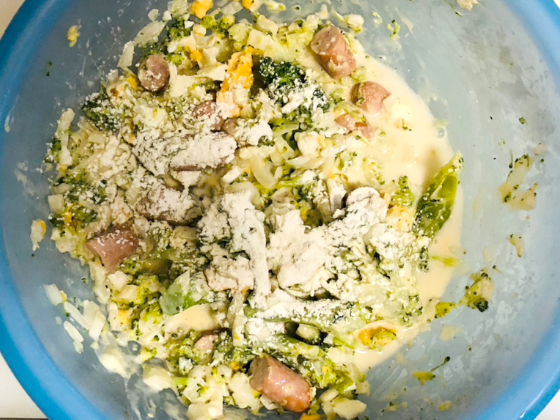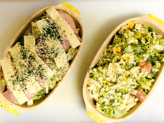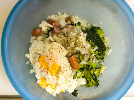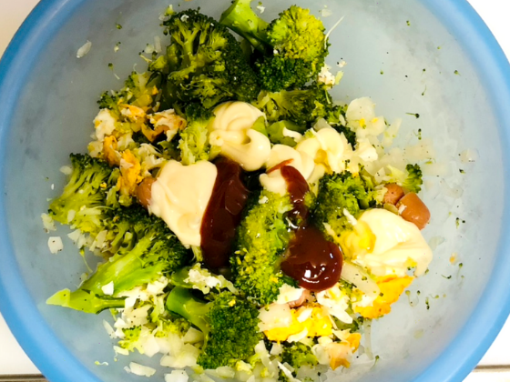 ① ボウルに下ごしらえしたブロッコリー、玉ねぎ、ウインナーと加熱したたまごを加えてよく混ぜ合わせる。