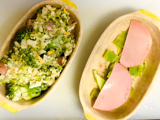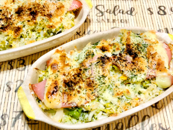 ④ 耐熱皿にブロッコリーの茎をひいてその上にハムをのせ③を敷き詰めていく。