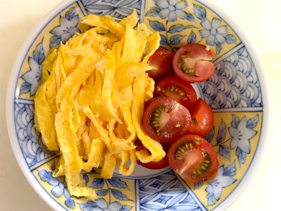 ・たまごは錦糸卵を作っておき、ミニトマトは半分に切り分ける。