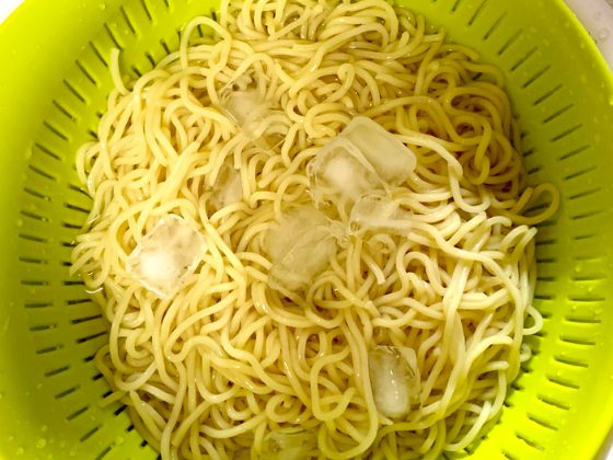 ② 中華麺をほぐしながら20〜30秒茹でたらザルにあげ、中華麺は氷水で冷やし冷ます。