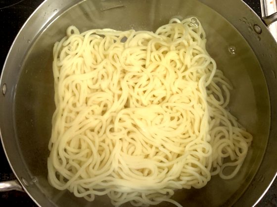 ① お鍋に水を沸騰させて、中華麺を入れる。