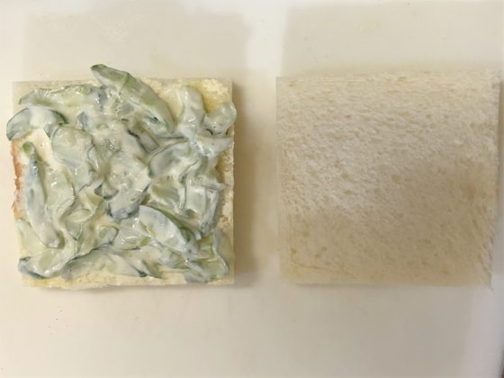 ① 耳を切った食パンにマーガリンを薄く塗り、下ごしらえしたきゅうりを広げもう1枚の食パンで挟んでいく。