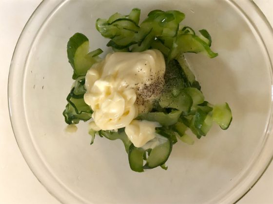 ・塩揉み&下ごしらえしたきゅうりをボウルに入れてマヨネーズ、こしょうを加え混ぜ合わせておきましょう。