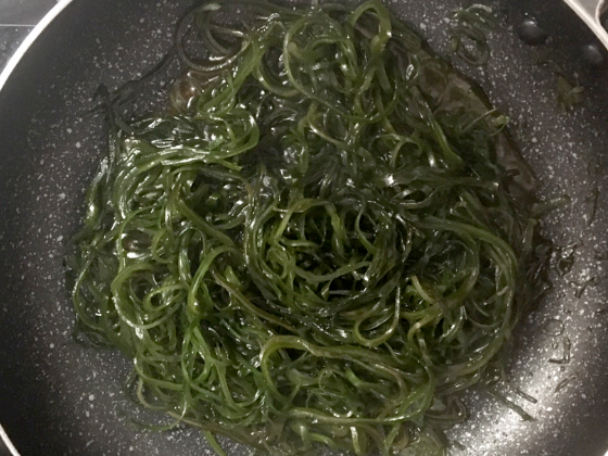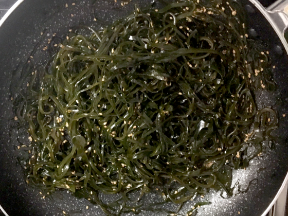 ① フライパンにごま油を引き、切り昆布を炒めていく(火加減は中火で3分ほど)。