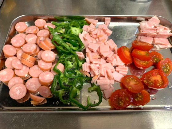 ・ウインナー、ピーマン、ハム、ベーコン、ミニトマトを食べやすい大きさに切り分ける。
