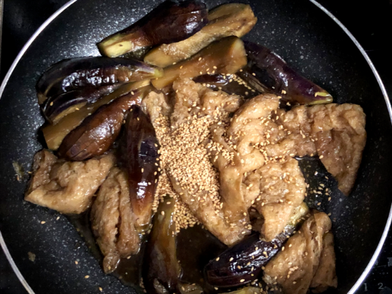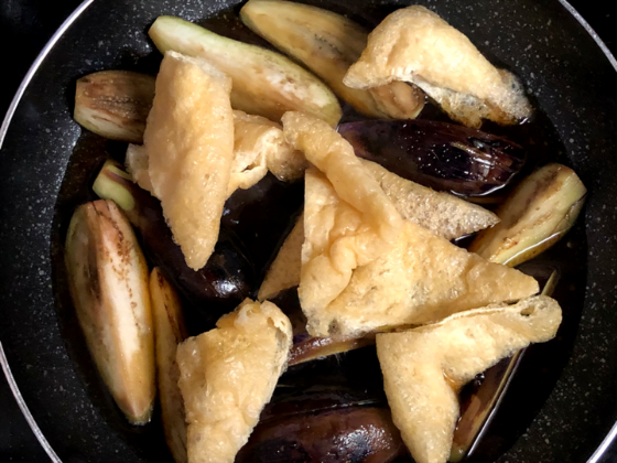 ② なすの両面に焼き色がついてきたら水と油揚げを加える。