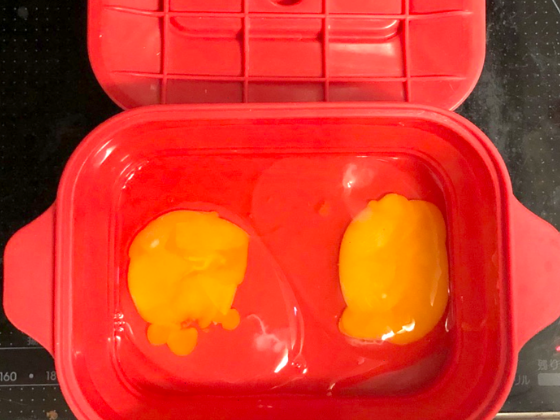 ・シリコン耐熱容器にたまご2個を入れてフォークで少しほぐしレンジ600wで2分加熱する。