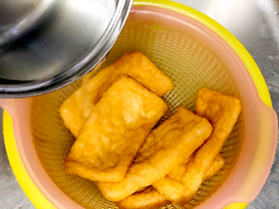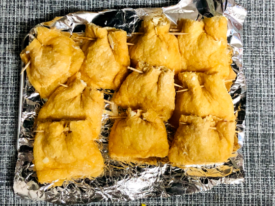 ② 油抜きした油揚げに①をぎゅうぎゅうに詰め油揚げの端を爪楊枝で止める。