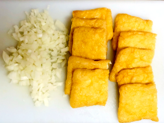 ・玉ねぎはみじん切りに油揚げは半分に切っておきましょう。