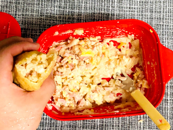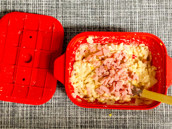① 下ごしらえしたたまごをつぶし玉ねぎ(みじん切り)、塩胡椒、お酢、マヨネーズ、ケチャップ、ハムを加えて混ぜ合わせさらにとろけるチーズを加えてよく混ぜます。