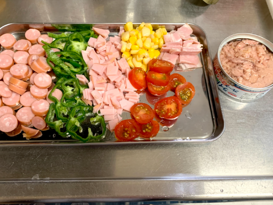 ・ウインナー、ピーマン、ハム、ベーコン、ミニトマトを食べやすい大きさに切り分けツナ缶を用意しておく。