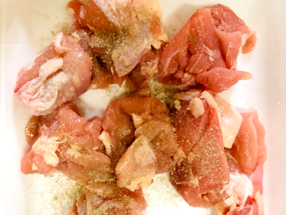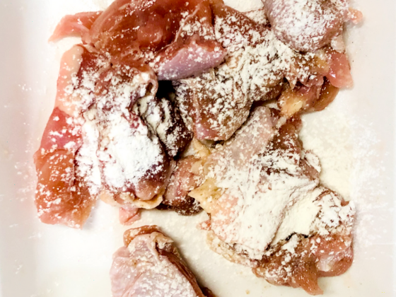 ・塩胡椒を鶏もも肉にまぶしたら、小麦粉を馴染ませておく。