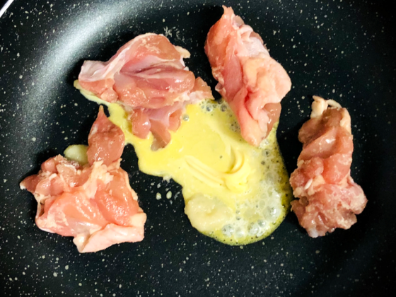 ① フライパンにバター10gとニンニクチューブを入れて火にかけ、下ごしらえした鶏もも肉の皮目から並べ両面こんがり焼き上げる。