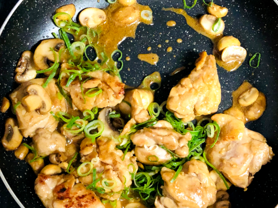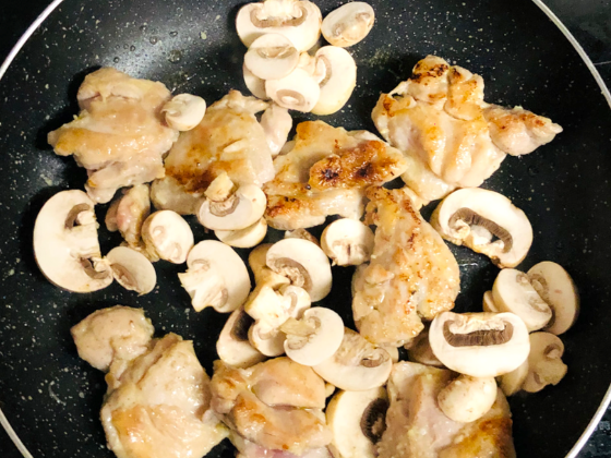 ② 両面焼き上がったらマッシュルームを加えて醤油、追いバター10gを入れサッと炒め合わせる。
