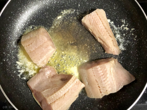 ① フライパンにバターを入れて、下ごしらえしたシマほっけを加える(火は中火で)。