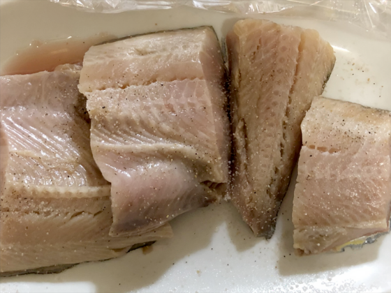 ・切り分けたシマほっけに塩胡椒をまぶす。