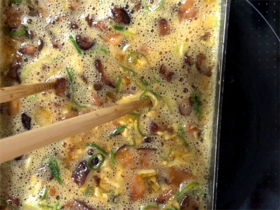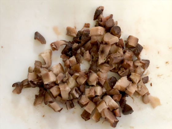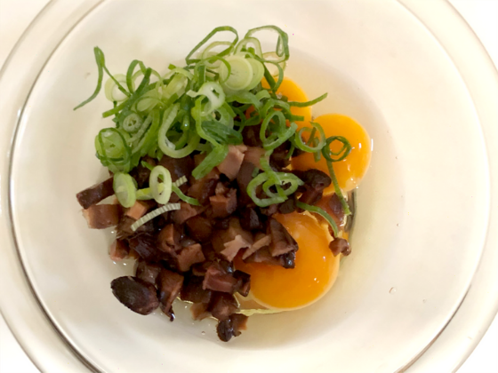 ・ボウルにたまごとみじん切りにした椎茸、カットネギ、味付け調味料を入れてよく混ぜ合わせる
