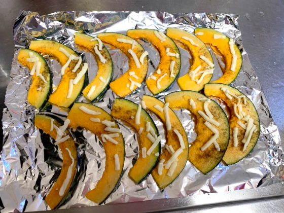 ・アルミホイルを敷き、かぼちゃを並べその上にピザ用チーズをのせる。