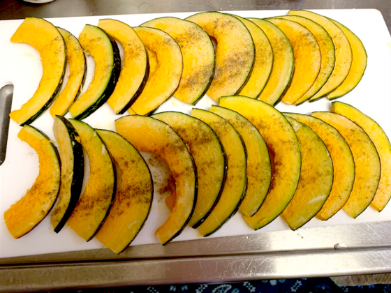 ・かぼちゃをスライスして、塩胡椒をふる(お好みで)かぼちゃはスライスしてあるものを買ってもOK。