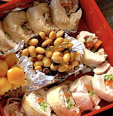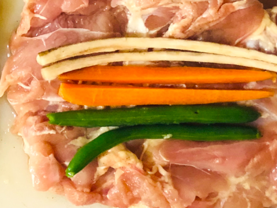 ・にんじんとごぼうは細切り、いんげんは長めのものを鶏肉の上に置きラップで巻いていく。