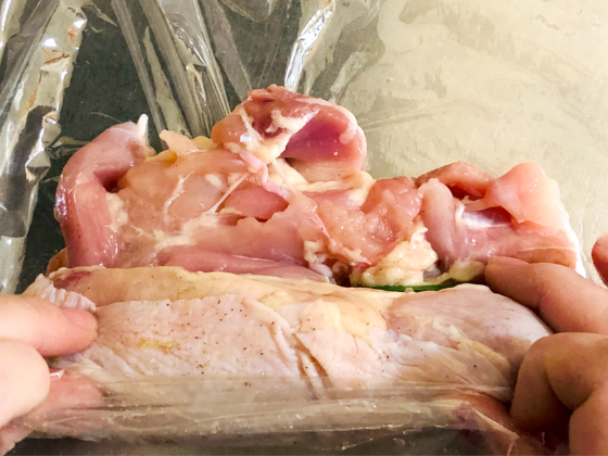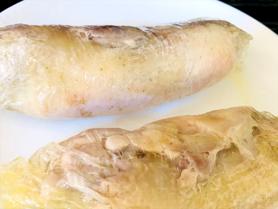 ① 下ごしらえした鶏もも肉の巻終わり後ラップの両端をしっかり絞り込み、ラップが解けないようにしましょう。