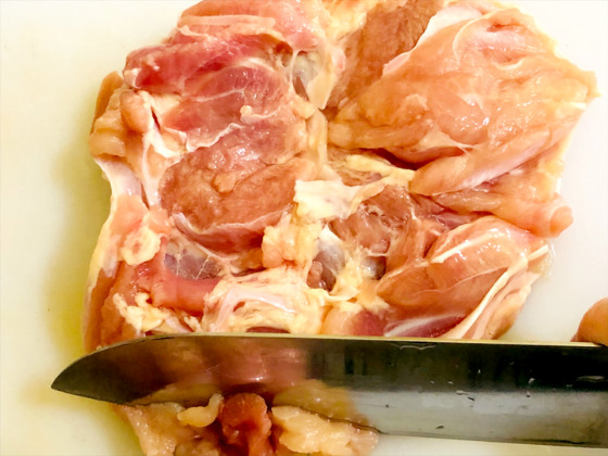・鶏もも肉を包丁で開いていく。