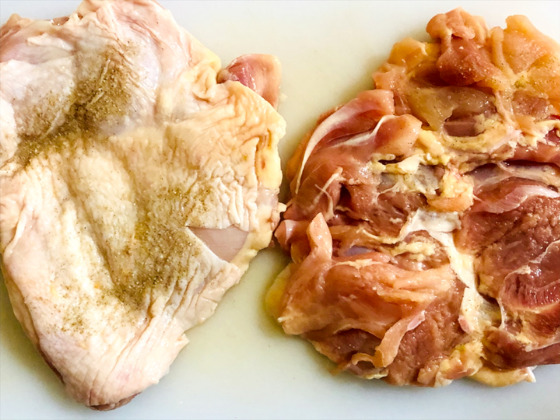 ・鶏もも肉を包丁で開いたら、裏表塩胡椒する。
