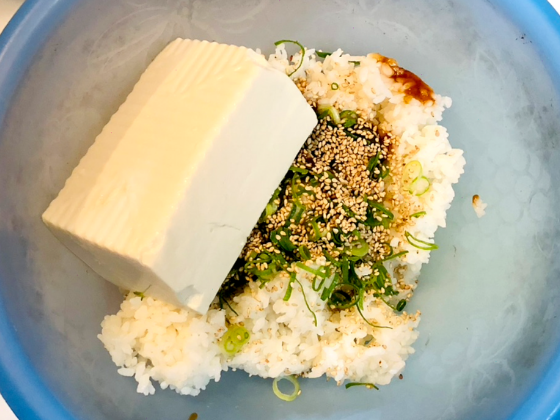 ・ボウルに、水気を切った絹ごし豆腐、ごはん、おにぎり調味料を混ぜ合わせておく。