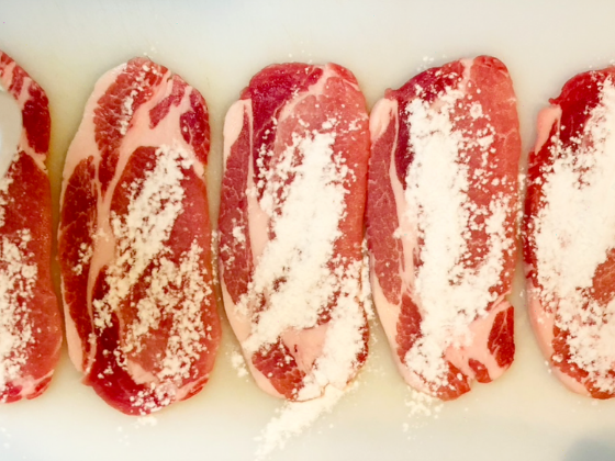 豚肉生姜焼き用ロースの内側に片栗粉をまぶしておく。