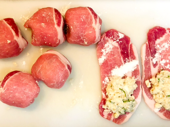 ・片栗粉をまぶした豚肉生姜焼き用ロースにおにぎり調味料と混ぜ合わせた豆腐とごはんをのせてくるくると巻いていく(量は大きめのスプーン1杯ぐらいの量を目安に)。