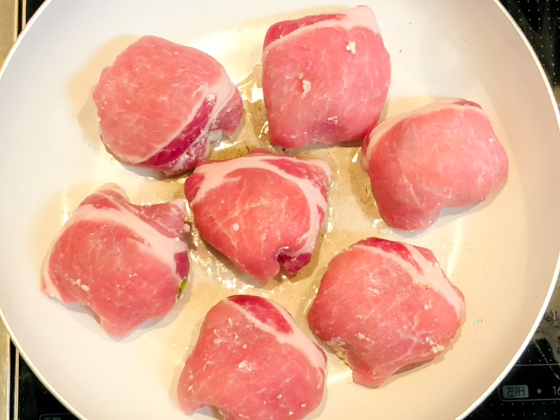 ① フライパンにサラダ油をひき火をつけて、巻き終わりが下になるようにして両面を焼き色がついてくるまで焼いていきましょう(中火で5分くらい)。