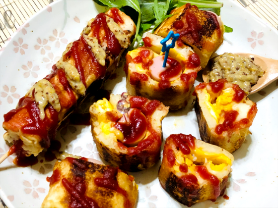 粒マスタードとはちみつを混ぜ合わせた、ハニーマスタードで召し上がるのもおすすめ♪はじめに薄焼き卵を具材で巻くことで生地の中が早く火が通りやすくなります💫