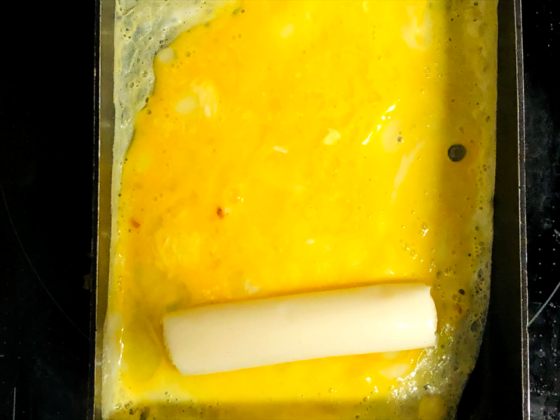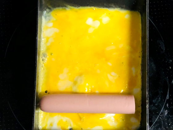 ① 卵焼き用フライパンにバター(5g)入れ、溶き卵を引き(1/3ほど)魚肉ソーセージを上に乗せて巻いていく。